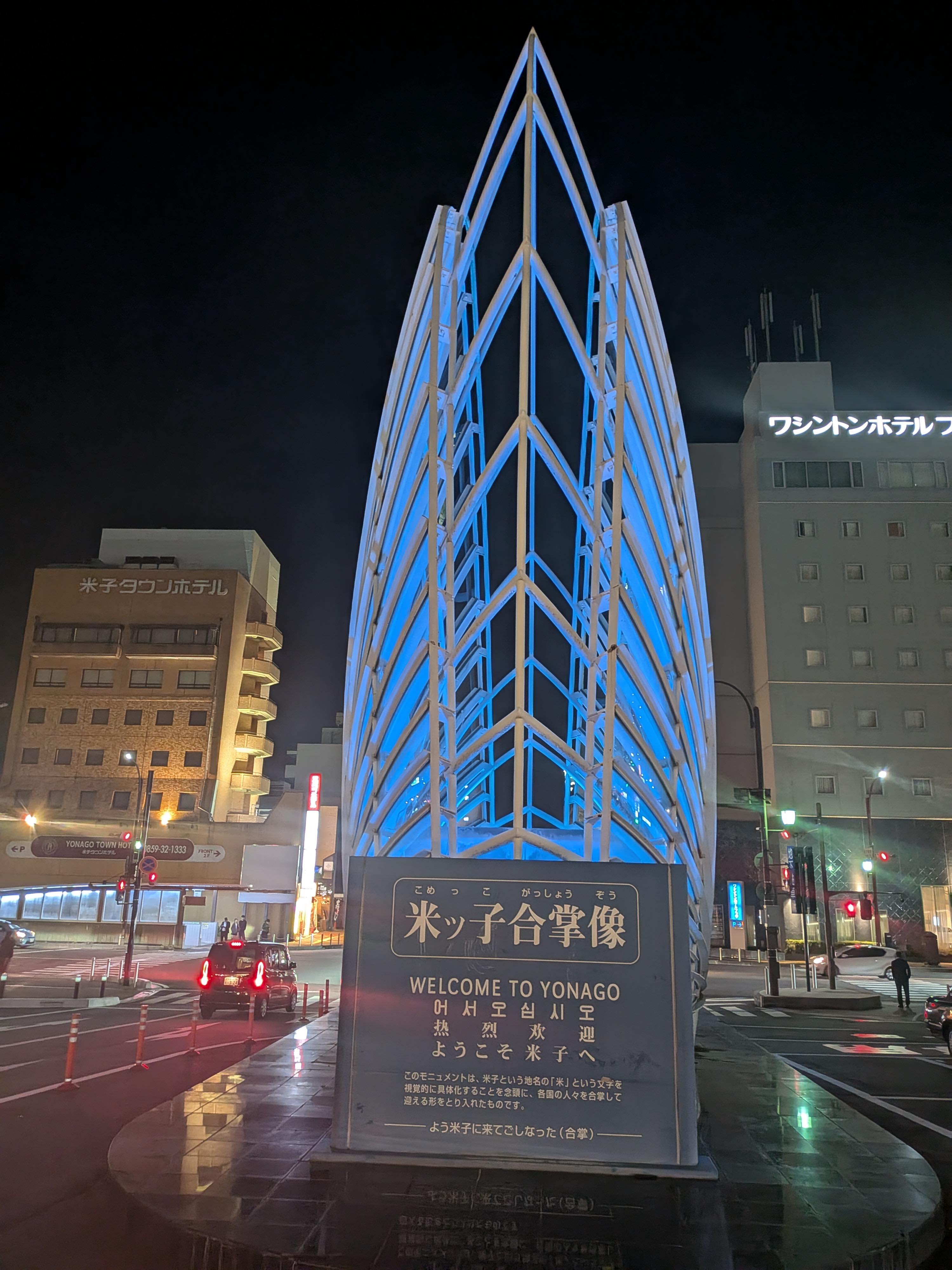 今年も米子市と連携し、10月27日(月)〜10月30日(木)の4日間限定で、国史跡・米子城跡及びJR米子駅前米ッ子合掌像をシンボルカラーのインディゴブルーにライトアップしました。