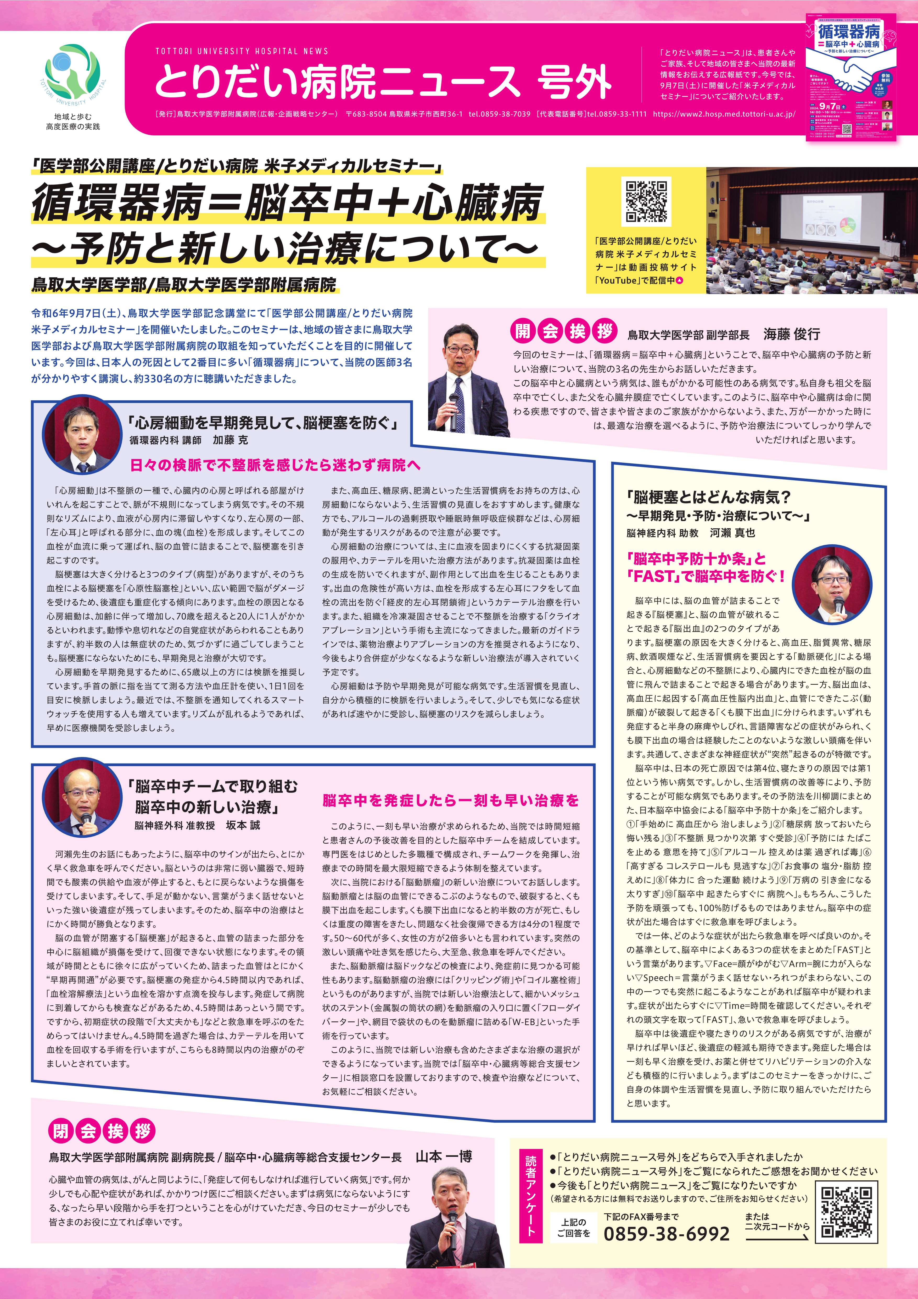 2024年9月7日(土)、鳥取大学医学部記念講堂(米子市西町86-3)にて「とりだい病院 米子メディカルセミナー」を開催しました。昨年度、倉吉市及び島根県松江市で開催したメディカルセミナー同様「循環器病=脳卒中+心臓病 ~予防と新しい治療について~」と題し、「循環器病」について分かりやすく講演いたしました。