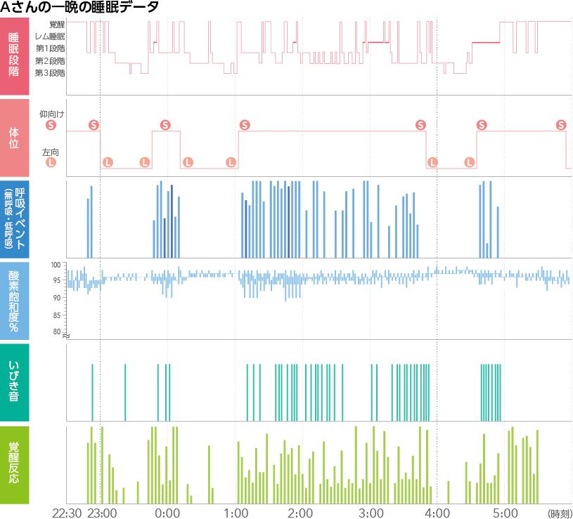 「Aさんの場合は、最低の酸素飽和度③は86%まで下がっています。低酸素で身体が酸欠状態になり、苦しくなって、ほんの数秒間覚醒する。バーっと激しく呼吸をして酸素を取り込む。すると酸素飽和度が正常値に戻って再び眠りにつく。しかしまた気道が狭くなりだし酸素が十分に入ってこなくなる。そしてまた覚醒する。これを一晩中、繰り返すわけです」