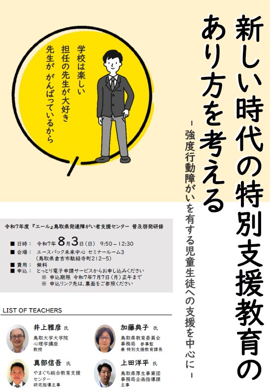『エール』鳥取県発達障がい者支援センターでは、発達障がいの正しい理解と対応について一層の啓発を図るため、下記の日程で研修会を開催いたします。新しい時代の特別支援教育について、有識者を交え、みんなで考える機会になることを期待しています。
